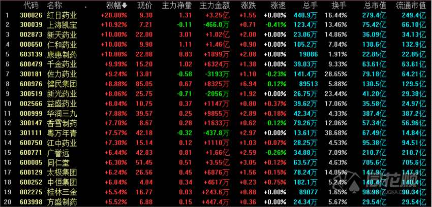 午后,中藥板塊持續(xù)走強(qiáng),截至收盤板塊漲幅3.84%,板塊中紅日藥業(yè)20CM漲停,上海凱寶(300039)漲超10%,新天藥業(yè)(002873)、仁和藥業(yè)、【康惠制藥(603139)、股吧】(603139)、千金藥業(yè)漲停。
