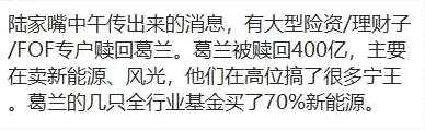 而寧德時代的暴跌,一則傳言也在市場上廣泛流傳。有傳聞稱,近日大機構贖回中歐明星基金經(jīng)理葛蘭的基金份額,據(jù)稱葛蘭管理的基金被贖回了400億。因為其在高位布局了不少寧德時代等新能源品種。