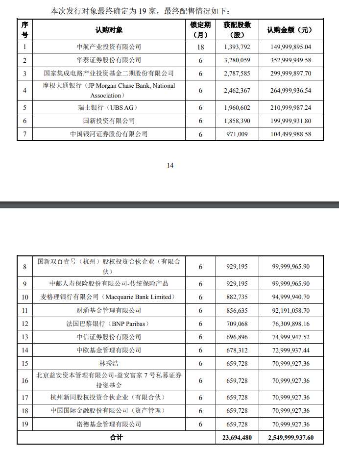 其中,華泰證券認(rèn)購金額最高,總花費(fèi)3.52億元獲配328萬股,大基金二期認(rèn)購金額達(dá)3億,獲配278.76萬股。同時(shí),控股股東中航國際控股關(guān)聯(lián)方中航產(chǎn)投認(rèn)購1.5億。