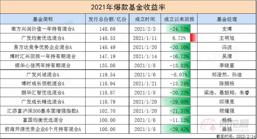 同順解圖寶統(tǒng)計去年發(fā)行超百億份額的爆款基金發(fā)現(xiàn),12只產(chǎn)品中僅一只實現(xiàn)正向收益,其余自成立以來皆虧損,更有一半虧損超20%。
