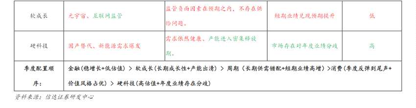 信達(dá)證券研發(fā)中心季度配置建議:金融(穩(wěn)增長+低估值)>軟成長(長期成長性+產(chǎn)能出清)>周期(長期供需錯配+短期業(yè)績高增)>消費(季度反彈到尾聲+價值風(fēng)格占優(yōu))>硬科技(高估值+年度業(yè)績存在分歧)。