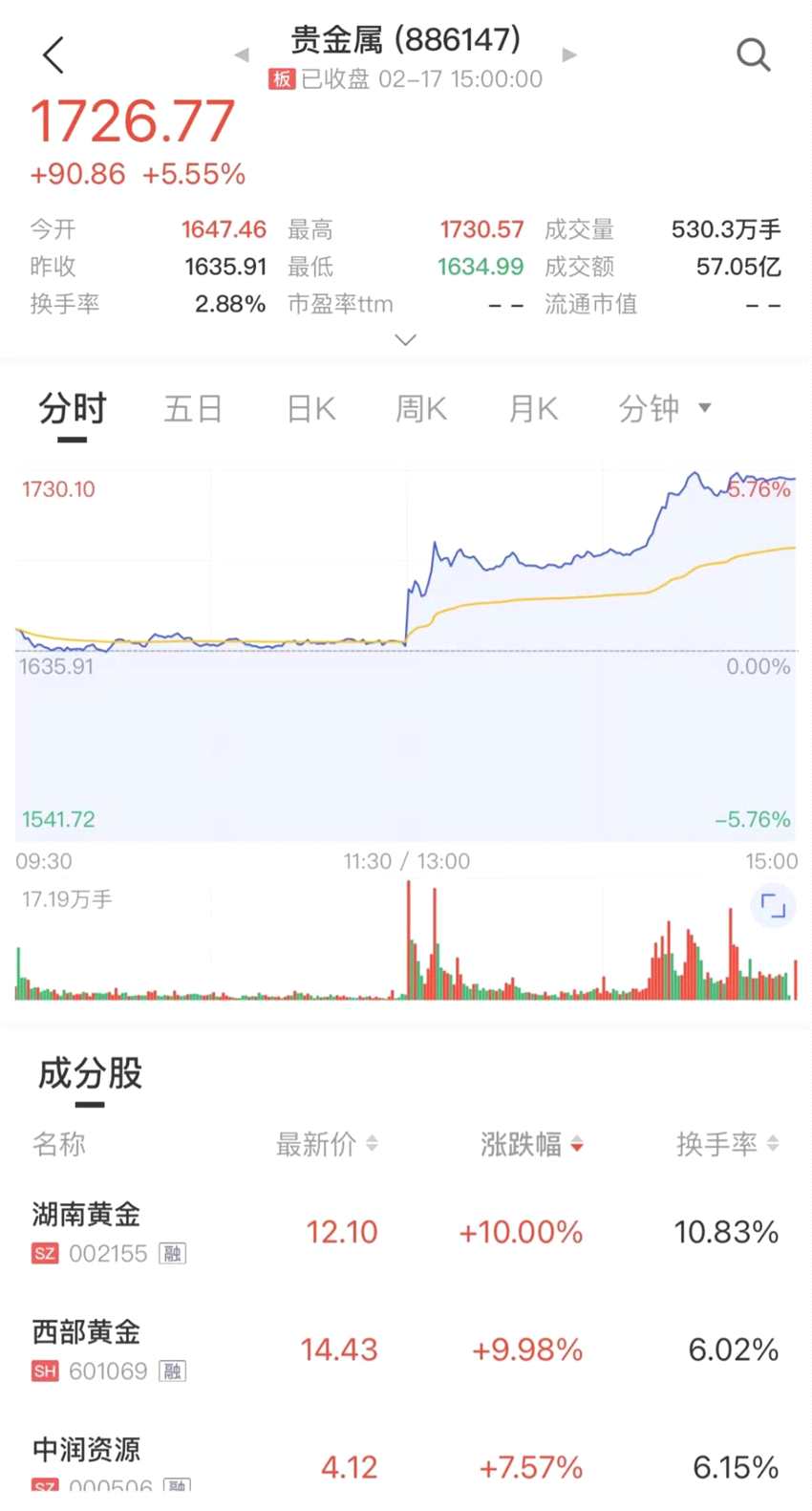 A股黃金股在午后也經(jīng)歷了兩次直線拉升。貴金屬板塊內(nèi),湖南黃金(002155)、【西部黃金(601069)、股吧】(601069)漲停,中潤(rùn)資源(000506)漲逾7%。