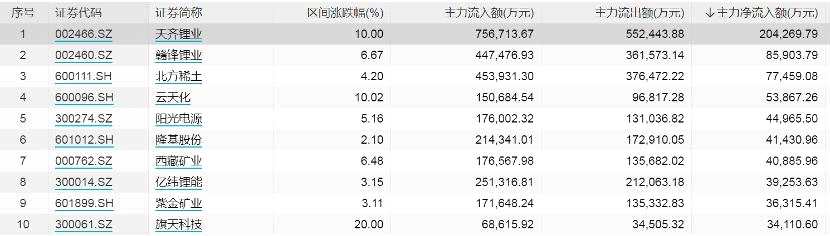 個(gè)股方面,天齊鋰業(yè)、贛鋒鋰業(yè)、北方稀土(600111)主力資金凈流入金額居前,分別凈流入20.43億元、8.59億元、7.75億元。恒寶股份(002104)、五糧液(000858)、中國電建(601669)主力資金凈流出金額居前,分別凈流出8.68億元、5.06億元、4.19億元。主力資金猛烈加倉鋰礦股,1417億市值的天齊鋰業(yè)獲主力資金凈流入超20億元,而恒寶股份等高位題材股被主力資金大幅減倉。此前9天7板的恒寶股份今日沖高回落,下跌9.14%,全天成交50.3億元,換手率高達(dá)57.13%。