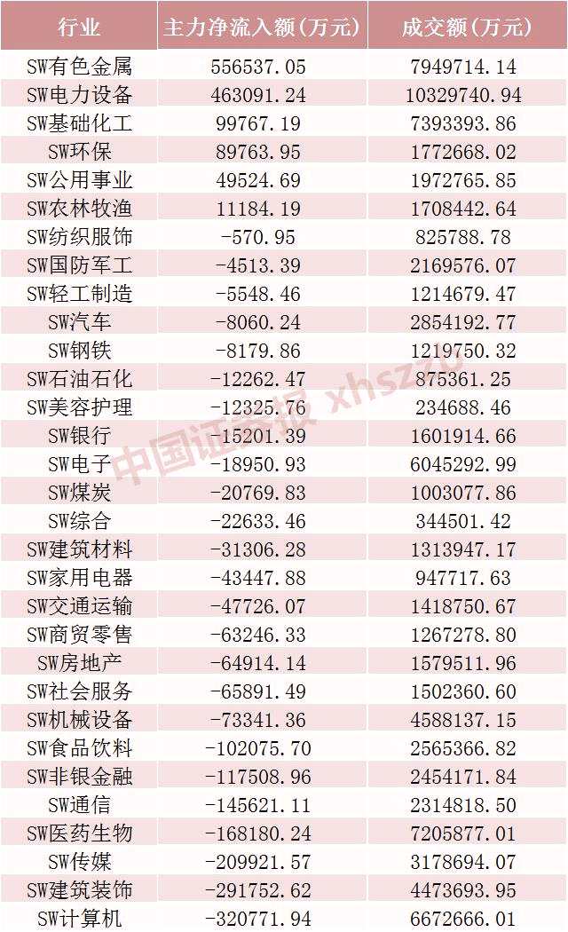 行業(yè)方面,數(shù)據(jù)顯示,今日有色金屬、電力設(shè)備、基礎(chǔ)化工行業(yè)主力資金凈流入金額居前,分別凈流入55.65億元、46.31億元、9.98億元;計(jì)算機(jī)、建筑裝飾、傳媒行業(yè)主力資金凈流出金額居前,分別凈流出32.08億元、29.18億元、20.99億元。
