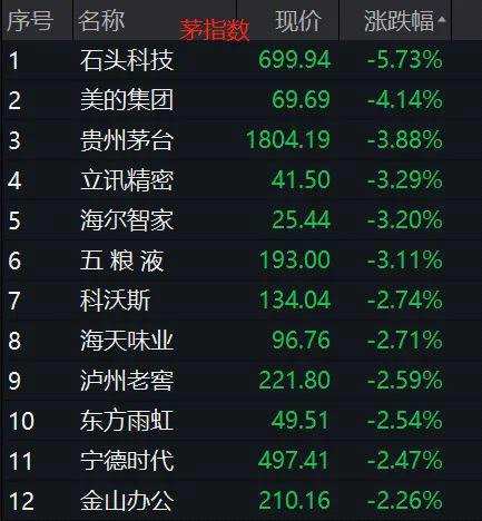 茅指數(shù)跌1.78%,跌幅也比各個主要指數(shù)大。茅指數(shù)當中,【石頭科技(688169)、股吧】大跌5.73%、美的集團(000333)跌超4%,立訊精密(002475)、海爾、五糧液(000858)等都跌超3%。