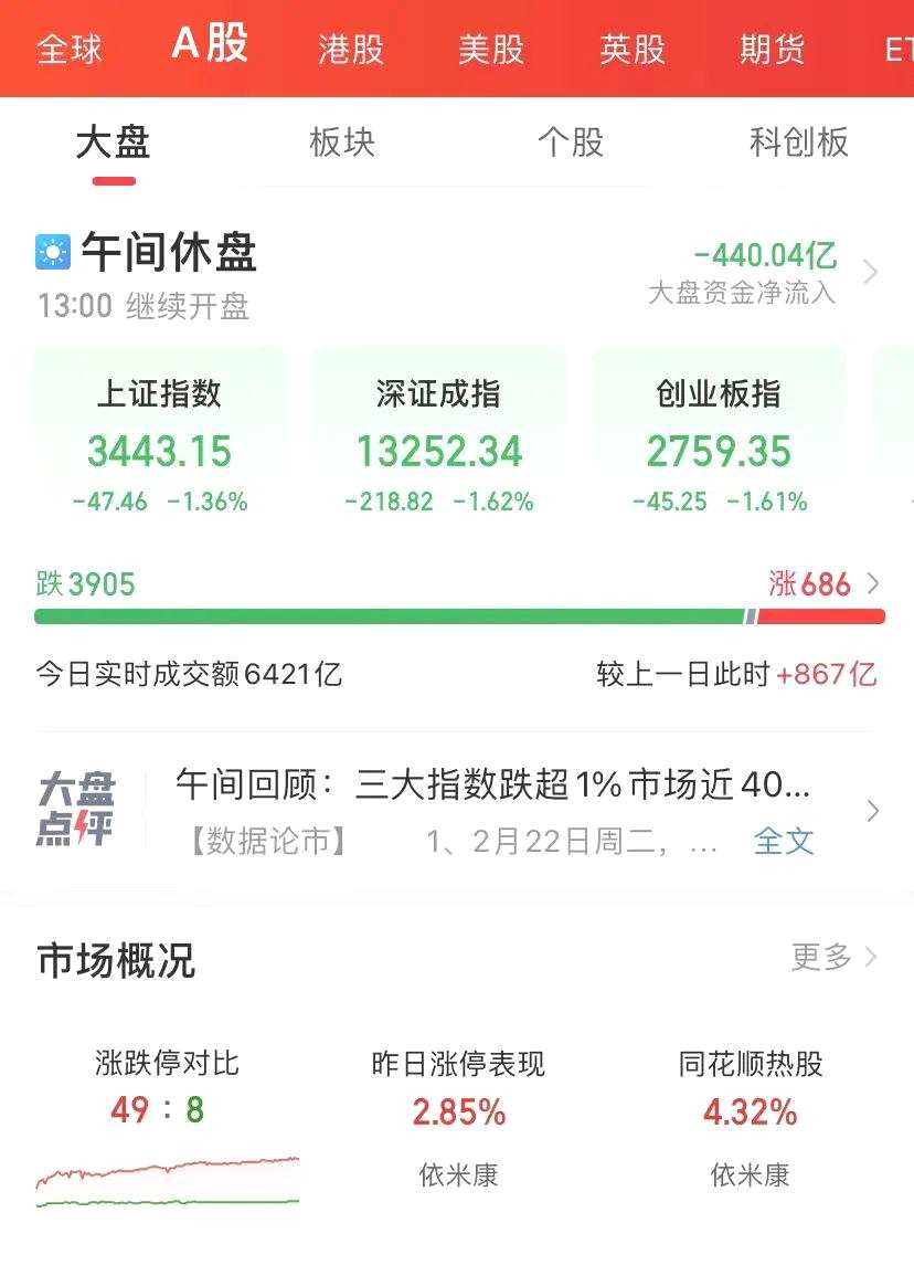 超級工程“東數(shù)西算”概念持續(xù)爆發(fā),逆勢上揚,油氣、黃金等避險板塊走強。今天上午個股和主要指數(shù)普跌,3905只個股下跌,上漲個股不到700只;主要指數(shù)震蕩走低,上證指數(shù)跌1.36%,深證成指跌1.62%,創(chuàng)業(yè)板指數(shù)跌1.61%,科創(chuàng)50指數(shù)跌0.96%,兩市成交額6413億元。