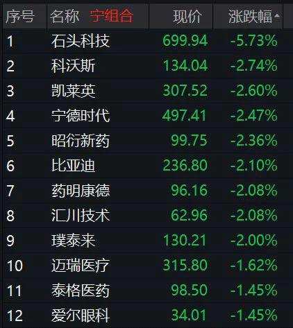 寧組合當中,石頭科技、科沃斯(603486)、凱萊英(002821)、【昭衍新藥(603127)、股吧】(603127)、比亞迪(002594)等也跌幅較大。
