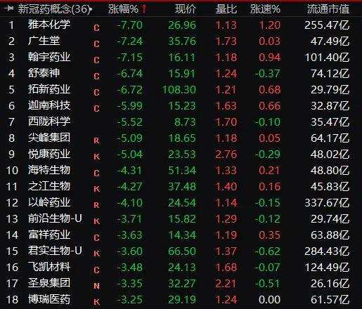 醫(yī)藥股也跌幅較大,新冠藥概念指數(shù)跌3%,雅本化學、廣生堂(300436)、【翰宇藥業(yè)(300199)、股吧】(300199)、舒泰神(300204)等跌幅較大。