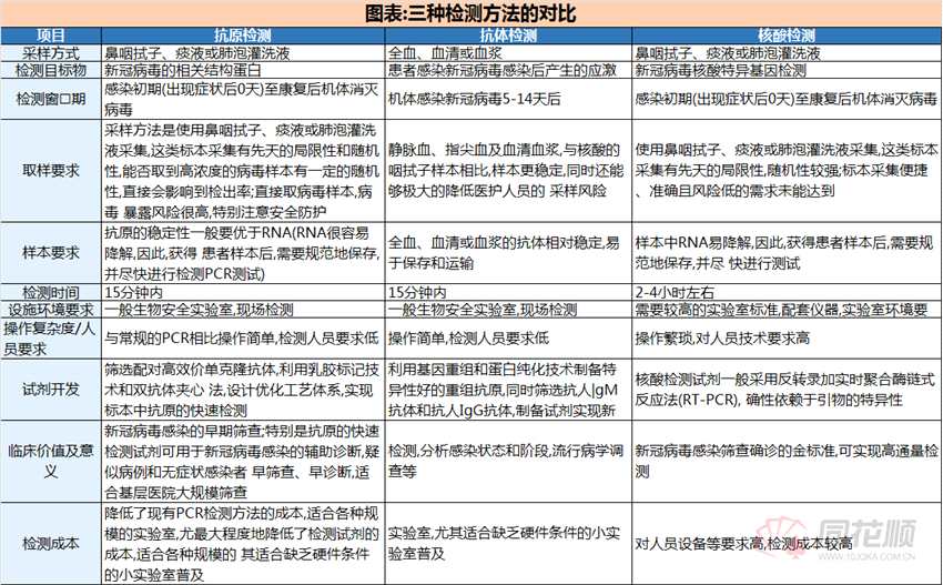 新冠檢測的方法包括核酸、抗原和抗體,其中核酸檢測為金標(biāo)準(zhǔn),但需要專業(yè)的 PCR 儀器檢測,等待時間較長;抗原檢測適用于檢測患病7天內(nèi)的患者,反應(yīng)速度較快,但靈敏度低于核酸,且存在假陰性的結(jié)果;抗體檢測主要通過檢測 IgM 或者 IgG,判斷是否感染過新冠病毒,但無法檢測新冠病毒感染早期的人群,抗體檢測存在窗口期。目前中國主要以核酸檢測為主,海外歐美發(fā)達(dá)國家主要以抗原檢測為主。