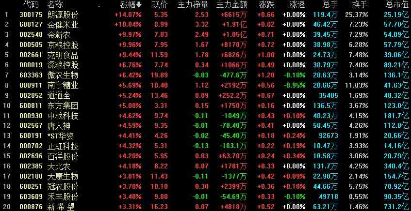 3月11日,A股市場整體表現(xiàn)低迷,種植業(yè)、農(nóng)產(chǎn)品加工等板塊早盤快速拉升,一舉逆襲,整體表現(xiàn)突出。朗源股份(300175)漲超14%,金健米業(yè)(600127)、【克明食品(002661)、股吧】(002661)、金新農(nóng)(002548)等多股漲停。