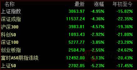2、截止收盤,滬指跌4.95%,深成指跌4.36%,創(chuàng)業(yè)板指跌2.55%;