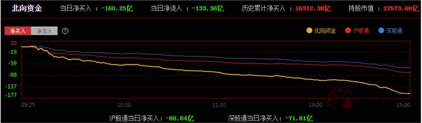 4、北向資金全天凈賣出160.25億元,其中滬股通凈賣出88.64億元,深股通凈賣出71.41億元。