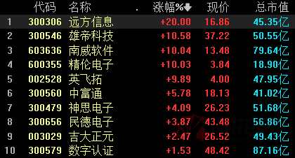 14日,電子身份證概念一枝獨(dú)秀,成為兩市唯一上漲的板塊,南威軟件(603636)漲停3連板,遠(yuǎn)方信息(300306)、英飛拓(002528)、精倫電子(600355)、神思電子(300479)、數(shù)字認(rèn)證(300579)、雄帝科技(300546)等跟漲。
