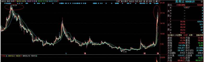 此外,我們發(fā)現(xiàn),2015年6月,美利云股價歷史股價最高值為46.03元,隨即之后就一路下滑,2017年11創(chuàng)次新高20.39元后,股價持續(xù)震蕩下行。截止今日股價報收于19.16元,逼近四年前的股價歷史次高位。