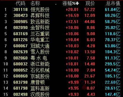 氫能源概念漲幅居前,恒光股份(301118)20%漲停,昇輝科技(300423)、致遠新能(300985)大漲超10%=%、金智科技(002090)、【蘭石重裝(603169)、股吧】(603169)、華電重工(601226)、冠城大通(600067)、雪人股份(002639)等多股漲停。