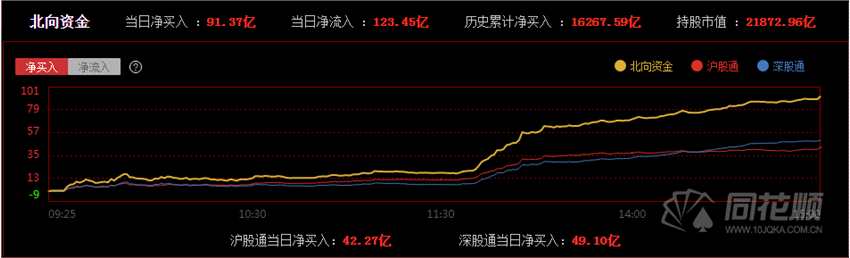 4、北向資金全天凈買入91.37億元,其中滬股通凈買入42.27億元,深股通凈買入49.10億元;