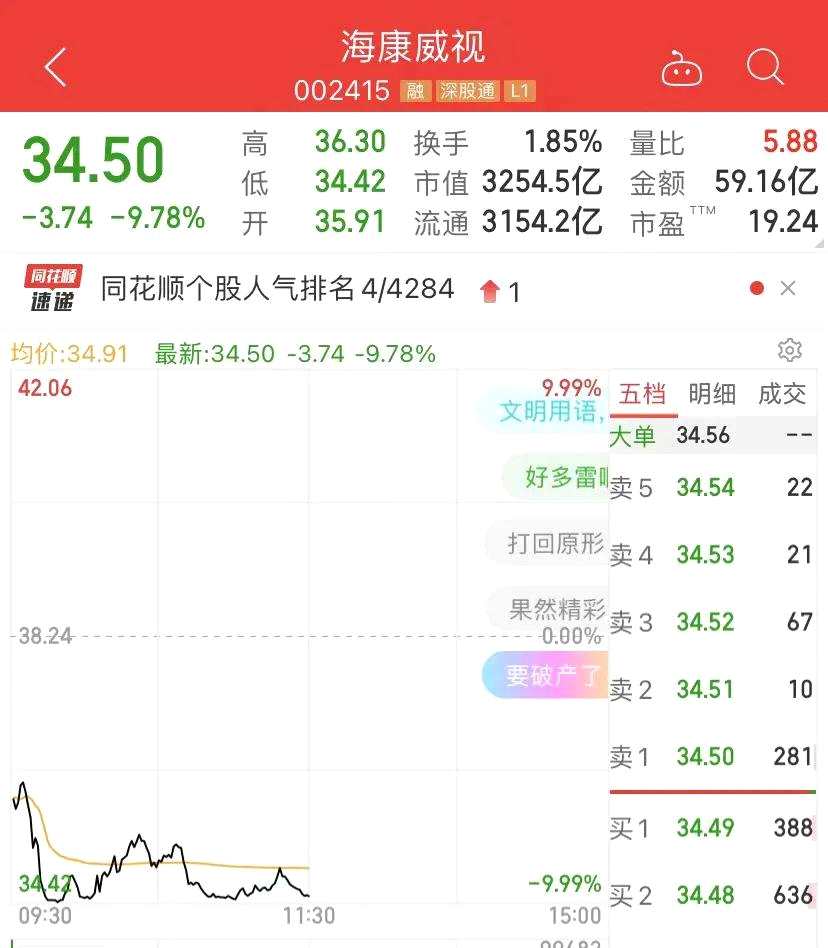 因?yàn)槊绹?guó)制裁傳聞,昨天跌停的??低暎裉斓烷_后再度快速觸及跌停,收盤仍逼近跌停。昨天市值還有3600億市值。