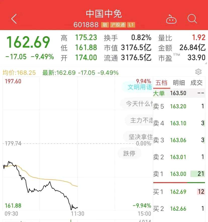 餐飲旅游板塊龍頭,3000多億的免稅茅中國(guó)中免盤中也逼近跌停,上午收盤跌超9%。