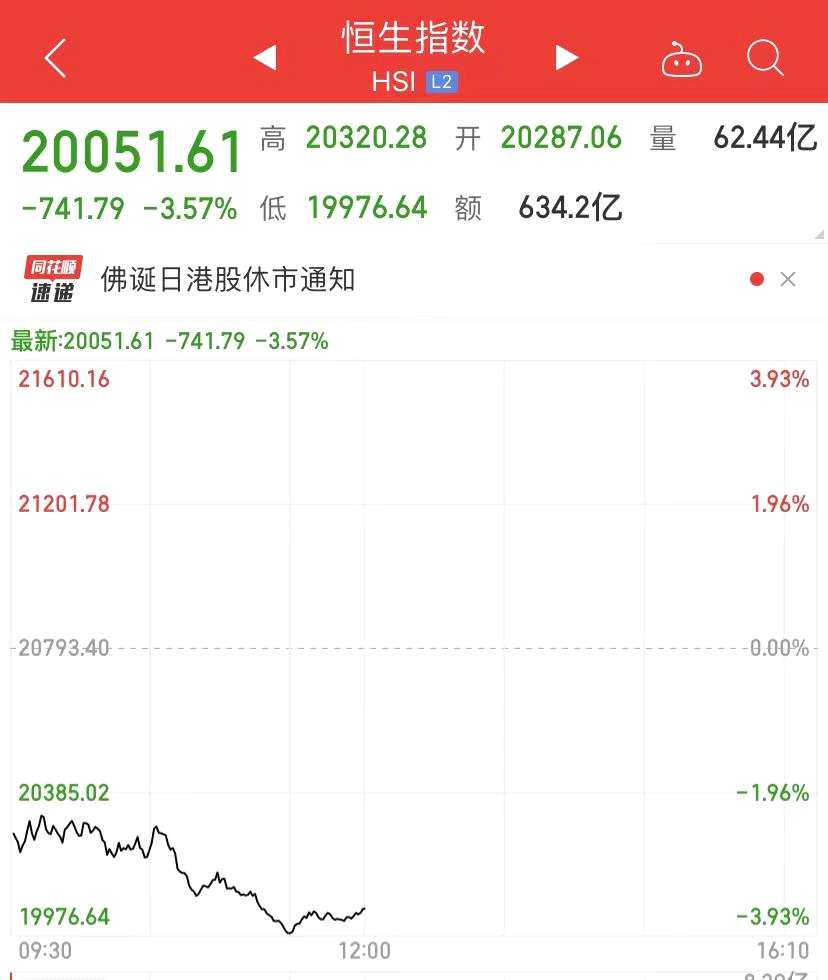 上午收盤,恒生指數(shù)跌3.57%,盤中一度跌超800點(diǎn),恒生國(guó)企指數(shù)跌4.07%,科技板塊恒生科技指數(shù)大跌超5%。