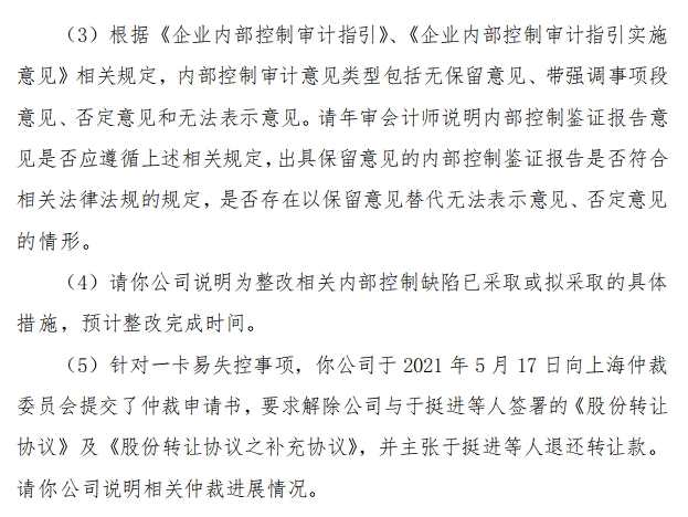 深交所在問詢函中要求從審計(jì)意見類型是否恰當(dāng)?一卡易股權(quán)投資期末賬面價(jià)值的確定依據(jù),金額是否真實(shí)、準(zhǔn)確等5個(gè)方面做出進(jìn)一步說明。