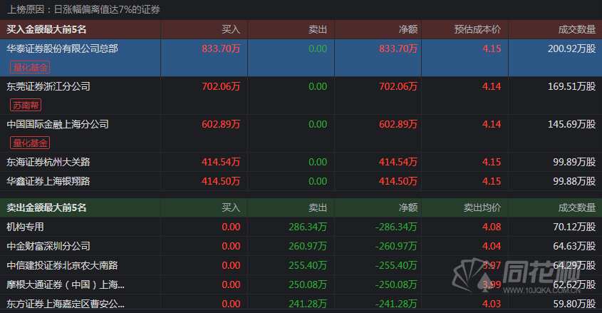 及今日港口航運(yùn)概念強(qiáng)勢(shì),連云港首板,盤后龍虎榜數(shù)據(jù)來(lái)看多家量化基金買入,華泰證券股份有限公司總部?jī)糍I入833.70萬(wàn)元,中國(guó)國(guó)際金融上海分公司凈買入602.89萬(wàn)元。另外蘇南幫凈買入702.06萬(wàn)元,