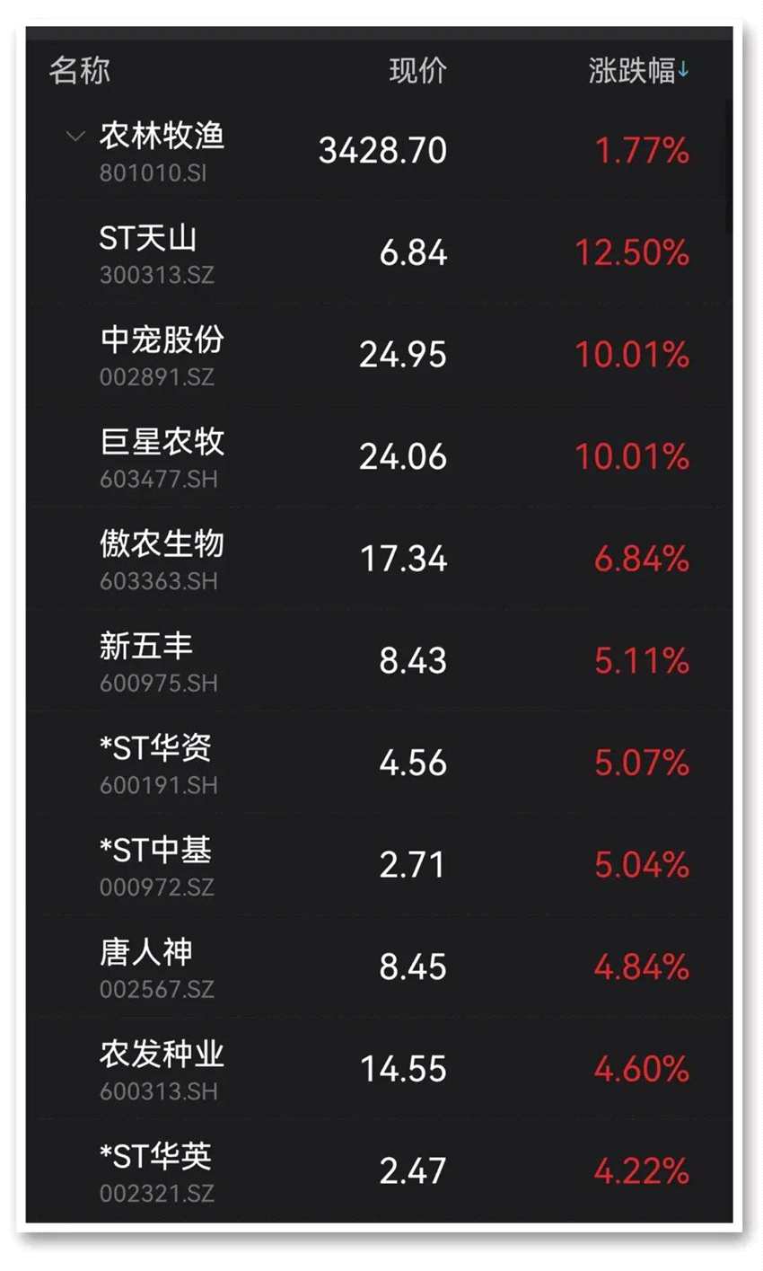 其中,ST天山(300313)大漲12.50%,巨星農(nóng)牧(603477)、中寵股份(002891)雙雙漲停,傲農(nóng)生物(603363)、新五豐(600975)、唐人神(002567)、【農(nóng)發(fā)種業(yè)(600313)、股吧】(600313)等個(gè)股漲幅居前。