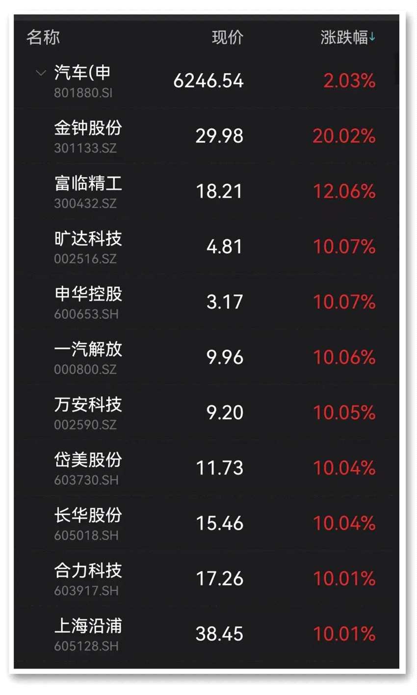 數(shù)據(jù)顯示,截至午間收盤,汽車以2.03%的漲幅居31個(gè)申萬(wàn)一級(jí)行業(yè)首位,其中金鐘股份(301133)斬獲“20CM”漲停,富臨精工(300432)漲半日大漲12.06%,曠達(dá)科技(002516)、【申華控股(600653)、股吧】(600653)、一汽解放(000800)、萬(wàn)安科技(002590)、岱美股份(603730)等10余只個(gè)股集體漲停。