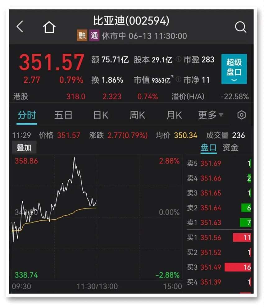 繼前一交易日大漲逾8%后,今日早盤比亞迪延續(xù)漲勢(shì),截至午間收盤,其A股漲幅收窄至0.79%,股價(jià)報(bào)351.57元/股,盤中一度觸及358.86元/股,再創(chuàng)歷史新高。