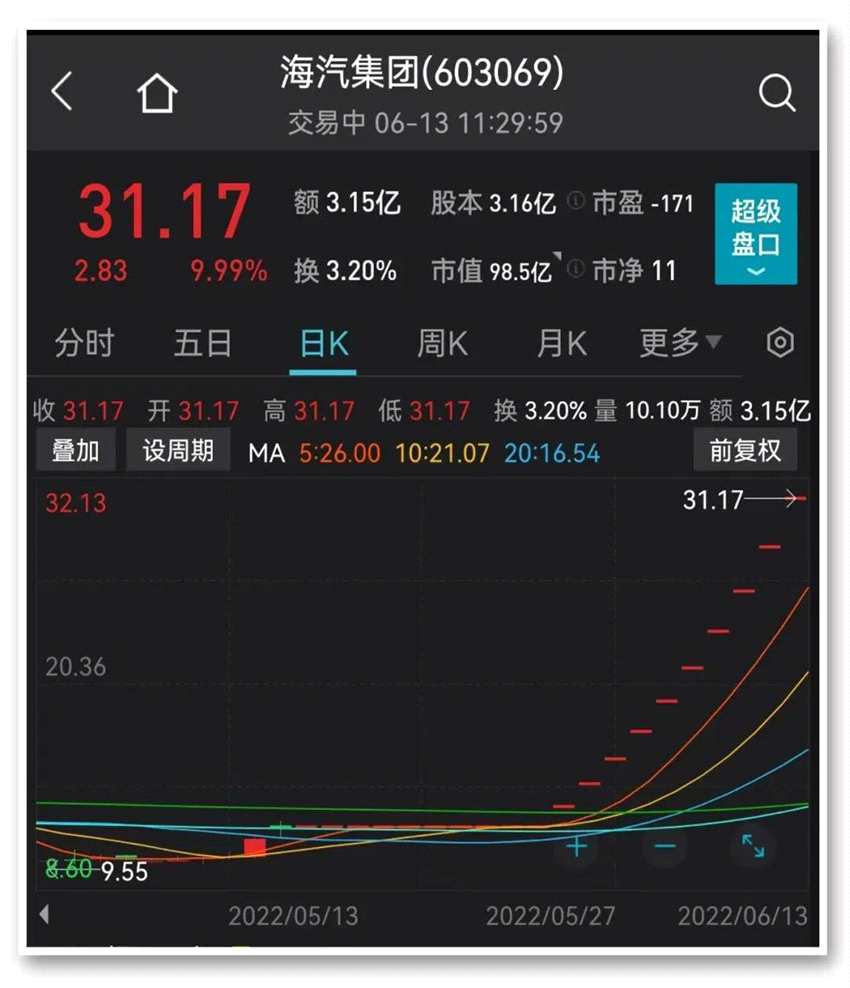 數(shù)據(jù)顯示,截至午間收盤,海汽集團(tuán)股價(jià)報(bào)31.17元/股,創(chuàng)下近17個(gè)月以來(lái)新高。從5月30日復(fù)盤至今,海汽集團(tuán)已連續(xù)斬獲10個(gè)漲停板,股價(jià)較停牌前的12.02元/股累計(jì)上漲近160%。