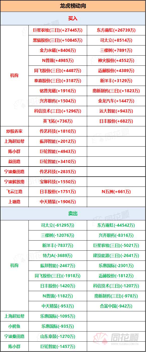 透視龍虎榜:巨星農(nóng)牧機構(gòu)凈買2億 資金搶籌人氣股博弈明日修復(fù)
