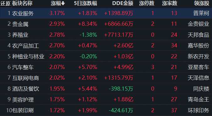 同花順(300033)行業(yè)方面,截至9月13日11:30,76類行業(yè)中58類上漲,占比76.32%,其中,農(nóng)業(yè)服務(wù)行業(yè)漲幅達3.17%,排名首位,貴金屬行業(yè)漲幅達2.93%,居第二位。下跌的行業(yè)中,醫(yī)療服務(wù)行業(yè)居首,跌幅達1.91%。