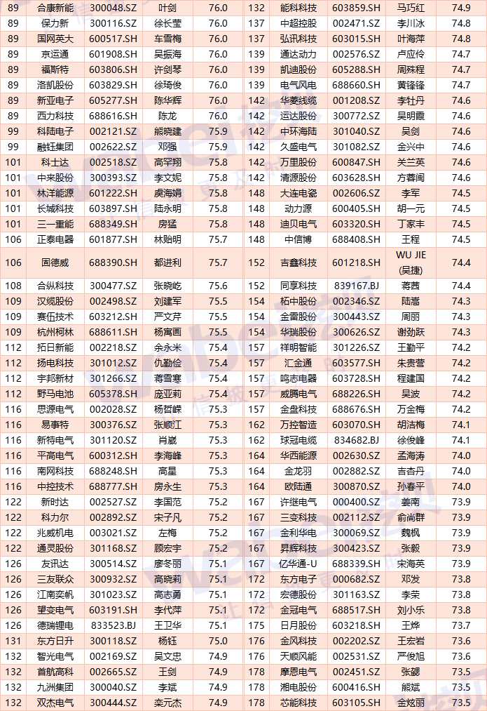 客觀得分排名后三位依次是:科泰電源(300153.SZ)楊慶林、上海電氣(601727.SH)周志炎、【智洋創(chuàng)新(688191)、股吧】(688191.SH)劉俊鵬,得分分別為:67.9分、67.4分、67.2分。
