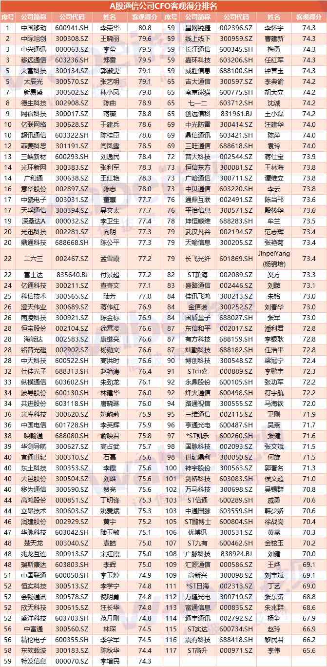 具體到通信行業(yè),共有117家A股公司的CFO參評,客觀得分平均為74.38分,低于全部A股公司CFO平均水平(75.17分)。