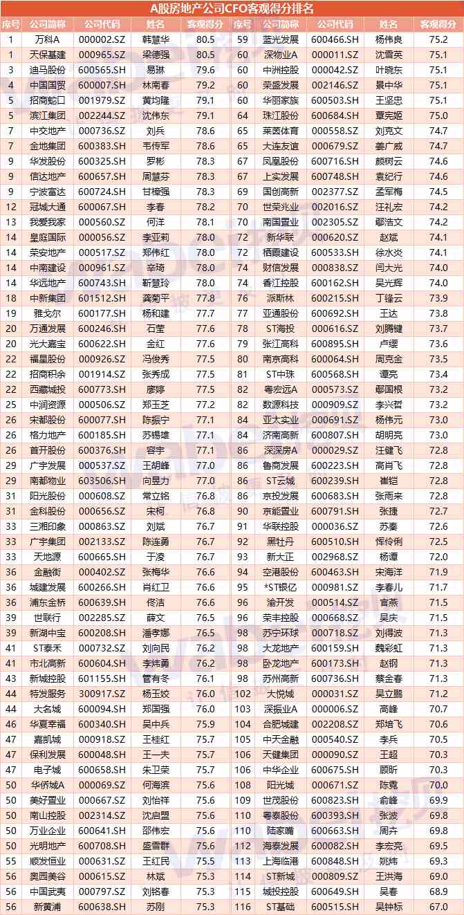 附-A股房地產(chǎn)公司CFO客觀得分排名
