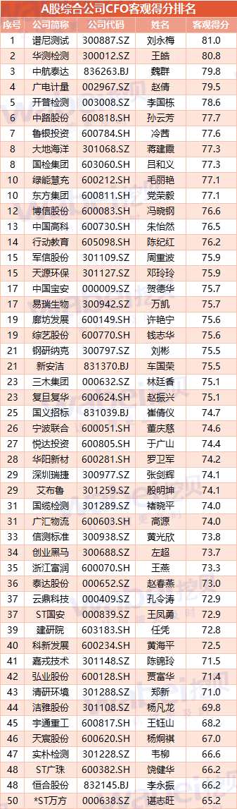 A股綜合公司CFO客觀評價(jià):譜尼測試劉永梅排第一 平均年齡47歲