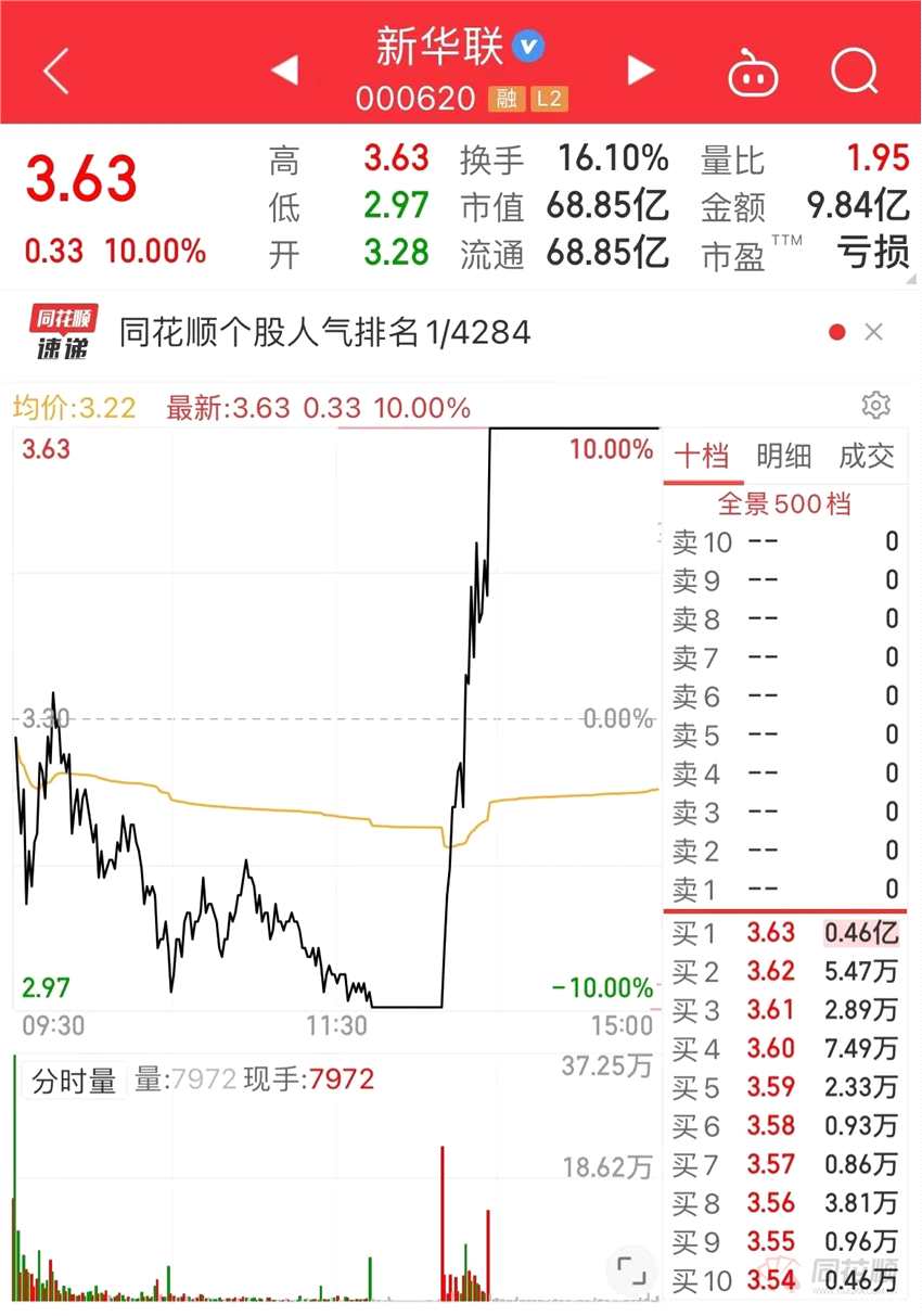 午后新華聯(lián)跌停翹板后強(qiáng)勢拉升,上演“地天板”,截至收盤,該股全天成交9.84億元,實(shí)際換手率41.47%。