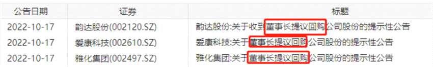 韻達股份、愛康科技、雅化集團、水晶光電四家公司則在同一天由董事長提議進行回購。