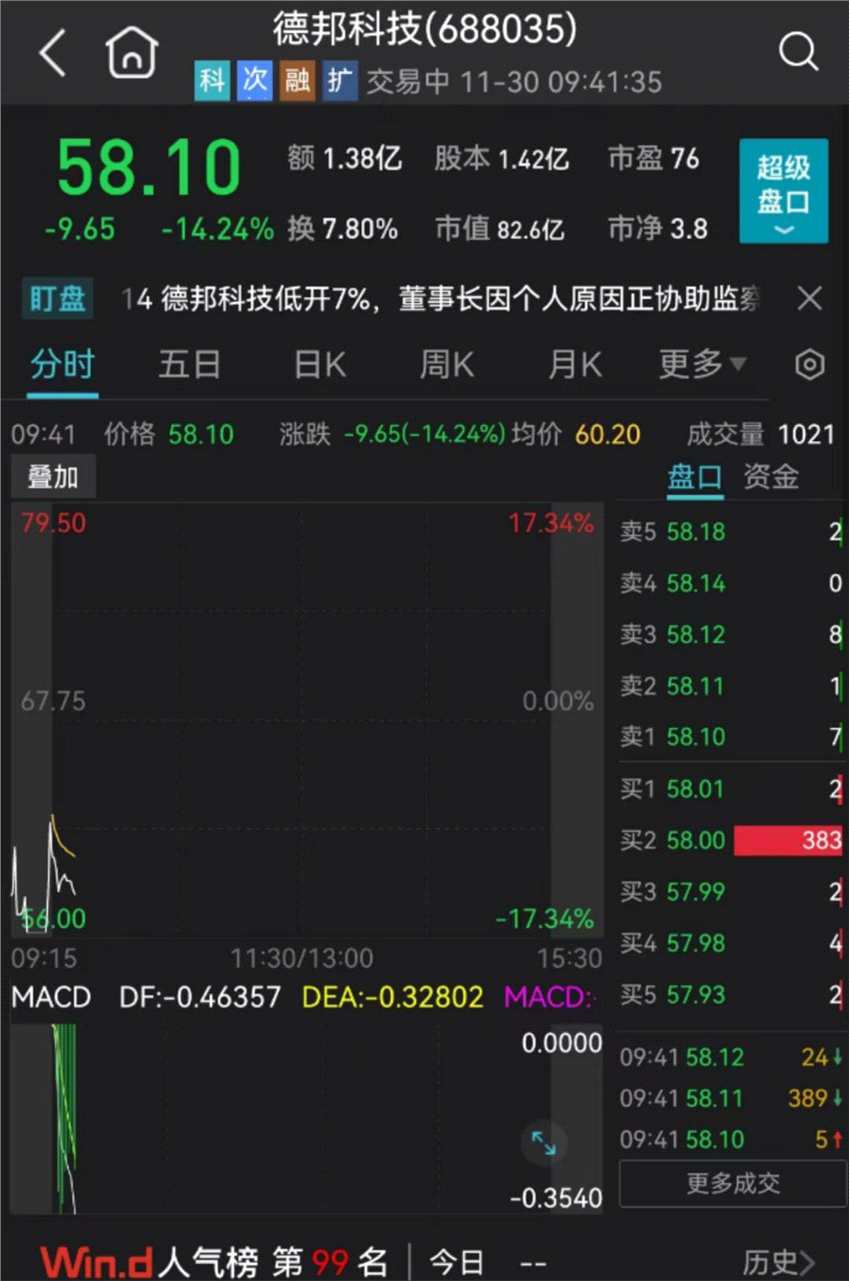 11月30日上午,上市僅70余天的科創(chuàng)板次新股德邦科技開盤股價不斷下挫,跌幅一度超過15%。