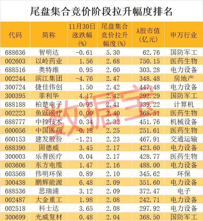 統(tǒng)計,尾盤集合競價3分鐘階段,逾120股拉升幅度在1%以上。智明達(dá)尾盤拉升幅度5.3%,競價階段只成交509手。新冠藥概念股以嶺藥業(yè)(002603)以2.68%的拉升幅度緊隨其后,尾盤競價階段成交5.31萬手,股價由綠盤翻紅。拉升幅度靠前的還有【奧特維(688516)、股吧】、濱江集團(tuán)(002244)等。