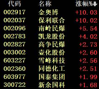 今天上午,民爆概念大漲,金奧博(002917)、【保利聯(lián)合(002037)、股吧】(002037)等個(gè)股漲停。