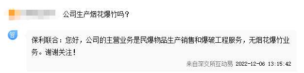 在投資者互動(dòng)平臺(tái)上,多家民爆企業(yè)被問(wèn)到“公司是否生產(chǎn)煙花爆竹”。