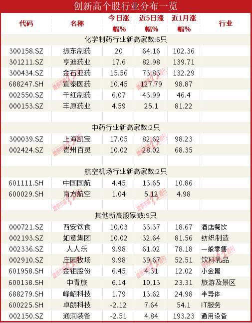 今日新高只有19只,從行業(yè)分布看,占比最多的是化學(xué)制藥板塊,今日出現(xiàn)6只新高股,另外中藥板塊與機(jī)場(chǎng)板塊,各有2只新高股?;瘜W(xué)制藥短線龍頭【宣泰醫(yī)藥(688247)、股吧】,今日雖然未能繼續(xù)封板,但漲幅依然超過10CM,換手更是超過50%,短線繼續(xù)擔(dān)當(dāng)領(lǐng)漲龍頭。