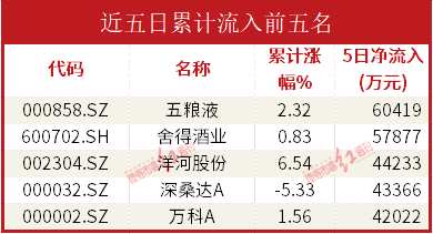近5日累計(jì)流入前5位與昨天一樣,為五糧液、舍得酒業(yè)(600702)、洋河股份(002304)、【深桑達(dá)A(000032)、股吧】與萬科A,只是順序稍區(qū)別,3只白酒股流入居前,其中五糧液凈流入6.04億元。