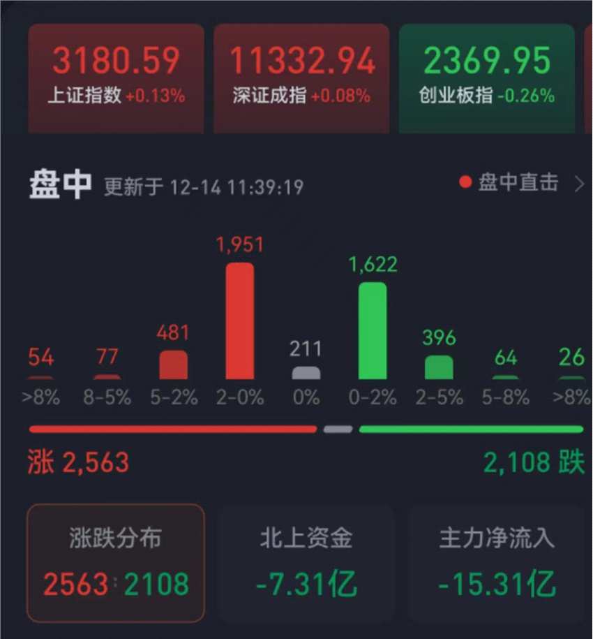 摘要: 周三(12月14日),三大股指繼續(xù)震蕩分化,漲跌不一。截至上午收盤,上證指數(shù)上漲0.13%,報(bào)3180.59點(diǎn);深證成指漲幅為0.08%,創(chuàng)業(yè)板指跌幅為0.26%;滬深兩市合計(jì)成交額4939.9億元,