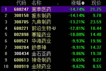 個股方面,兩市超4400只個股下跌,市場情緒低迷。醫(yī)藥板塊尾盤掀跌停潮,前期的人氣股,以嶺藥業(yè)(002603)(002603.SZ)、眾生藥業(yè)(002317)(002317.SZ)、【特一藥業(yè)(002728)、股吧】(002728)(002728.SZ)、太龍藥業(yè)(600222)(600222.SH)等近10股集體跌停,宣泰醫(yī)藥(688247.SH)、振東制藥(300158)(300158.SZ)、九典制藥(300705)(300705.SZ)、香雪制藥(300147)(300147.SZ)等多股跌超10%。