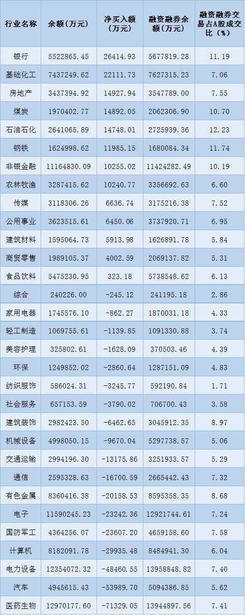 表:12月19日申萬(wàn)一級(jí)行業(yè)兩融交易情況: