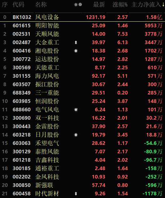 從早盤表現(xiàn)強(qiáng)勢(shì)的風(fēng)電設(shè)備看,行業(yè)交易中的21只個(gè)股全線上漲,其中3只漲幅超5%。