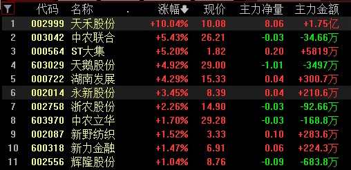 從表現(xiàn)強勢的供銷社看,板塊內(nèi)有11只個股實現(xiàn)上漲,其中,天禾股份(002999)、ST大集(000564)漲停,【中農(nóng)聯(lián)合(003042)、股吧】(003042)也大漲5.20%。