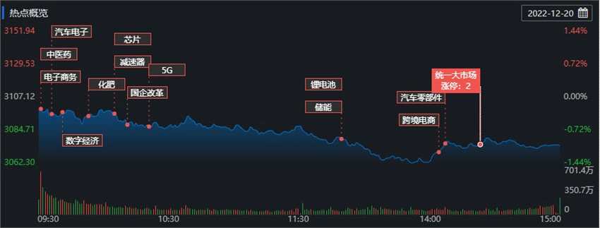 12月20日,A股三大指數(shù)繼續(xù)調(diào)整,上證指數(shù)跌超1%失守3100點關口。截至收盤,上證指數(shù)跌1.07%報3073.77點;深證成指跌1.58%報10949.12點,創(chuàng)業(yè)板指跌1.53%報2310.8點;兩市合計成交6398億元,北向資金凈買入11.56億元??傮w上看,A股個股跌多漲少,超2100只個股上漲,其中,漲停個股達33只,跌停個股達34只。