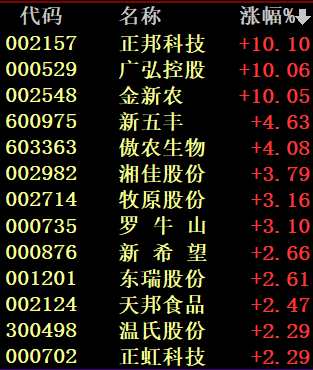 豬肉概念也大漲,【正邦科技(002157)、股吧】(002157)、金新農(nóng)(002548)等個股漲停。
